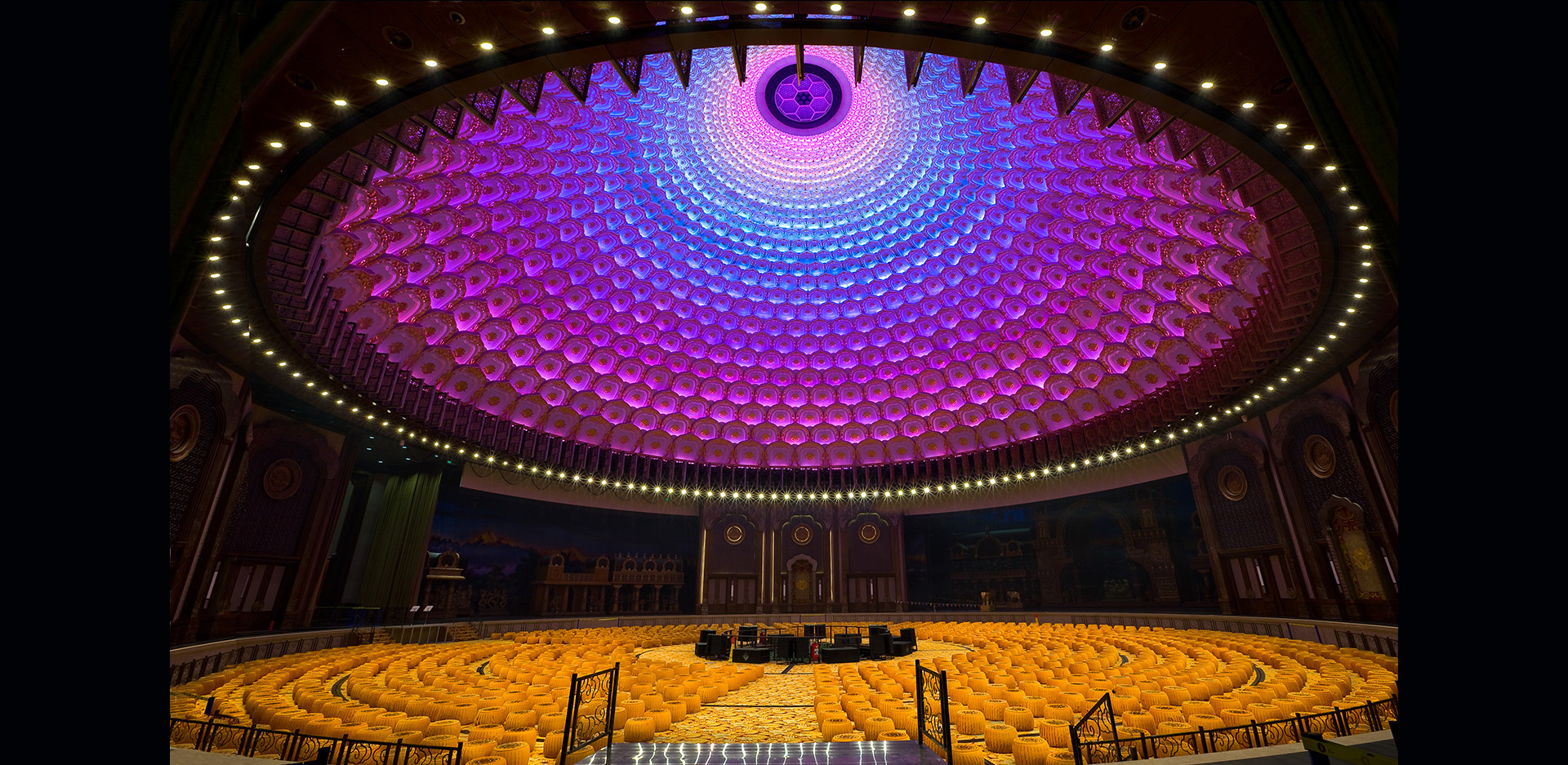 在充分了解建筑的平面布局及功用基础上,和室内设计反复研讨后,确定了以灯光表现建筑顶部、立面的精美雕刻和装饰壁画,以及通过幻彩灯光配合室内表演为主要设计目标。