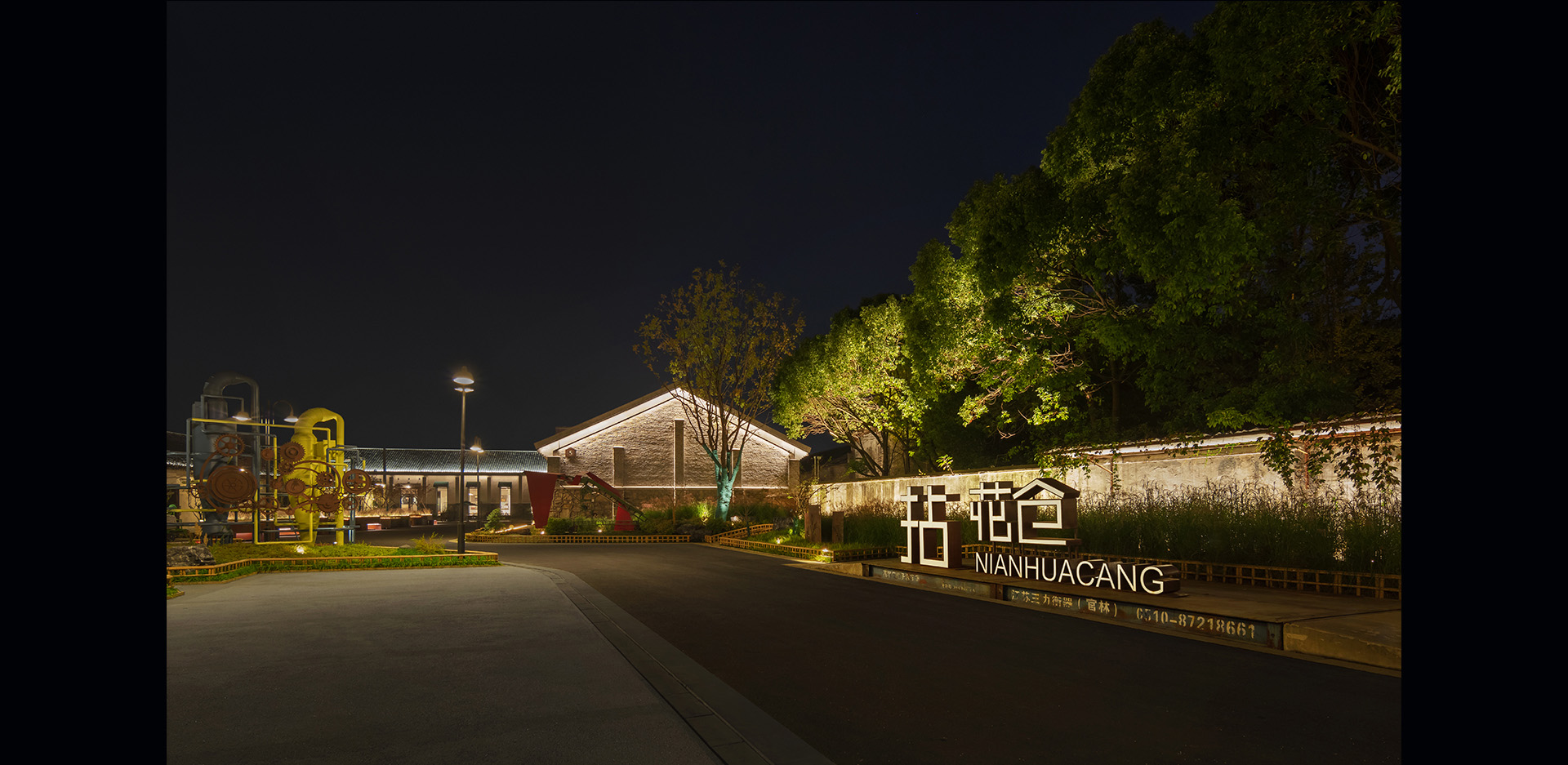 空间整体以引导照明,山墙、景墙和体现具有代表的粮仓遗留的机械作为主题空间元素,直观的体现出项目前身的功能属性。入口以左侧墙体延伸至建筑,空间关系及灯光形式更为协调统一。