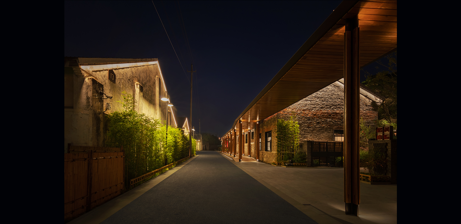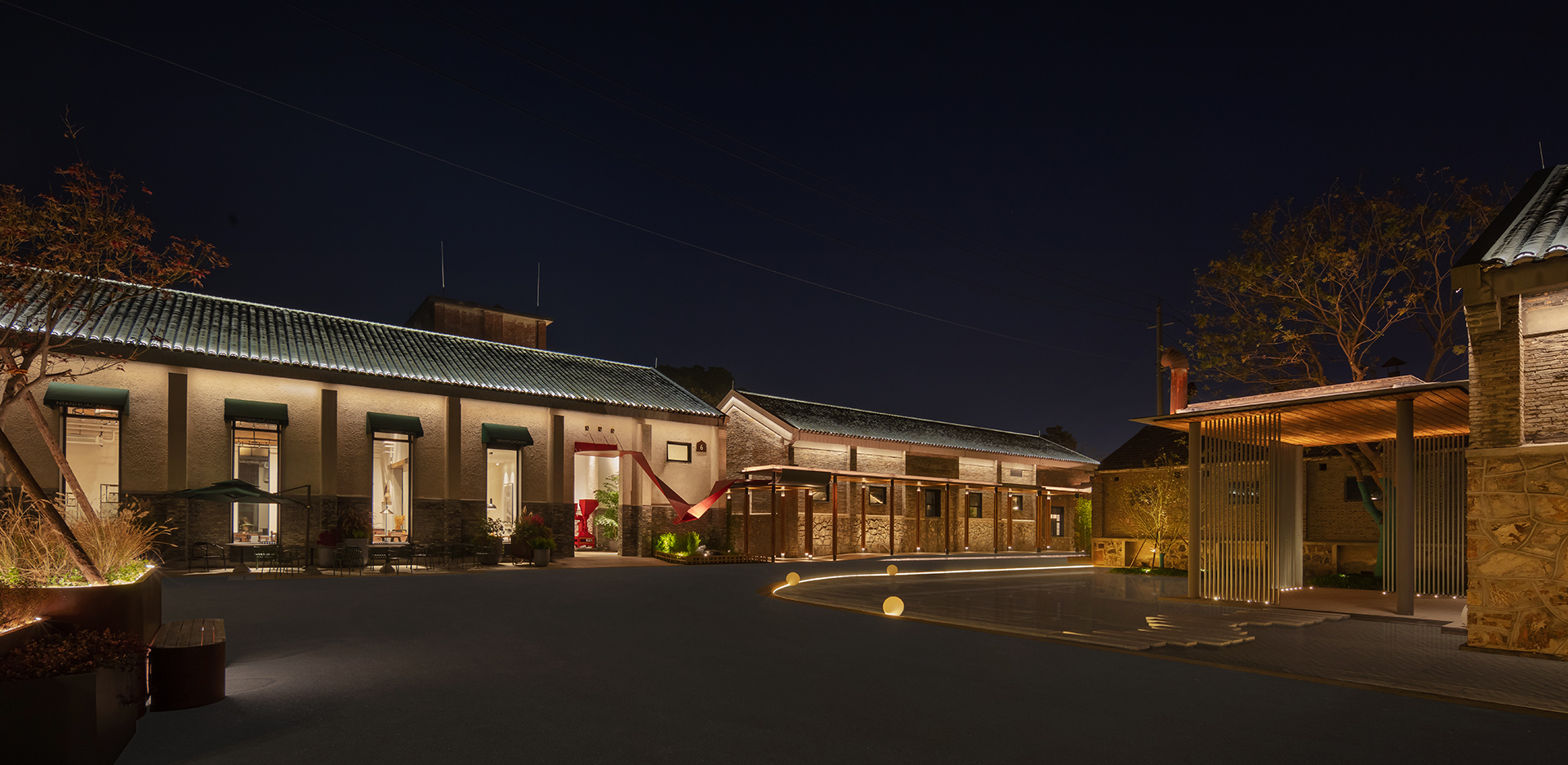 粮仓食堂和会议室的灯光主要还是考虑建筑上的光统一性,以下檐口下洗凹面,突出与立柱的明暗对比关系,建筑更为立体,同时也能满足使用亮度,强调出建筑墙面的斑驳感,更显有历史感
