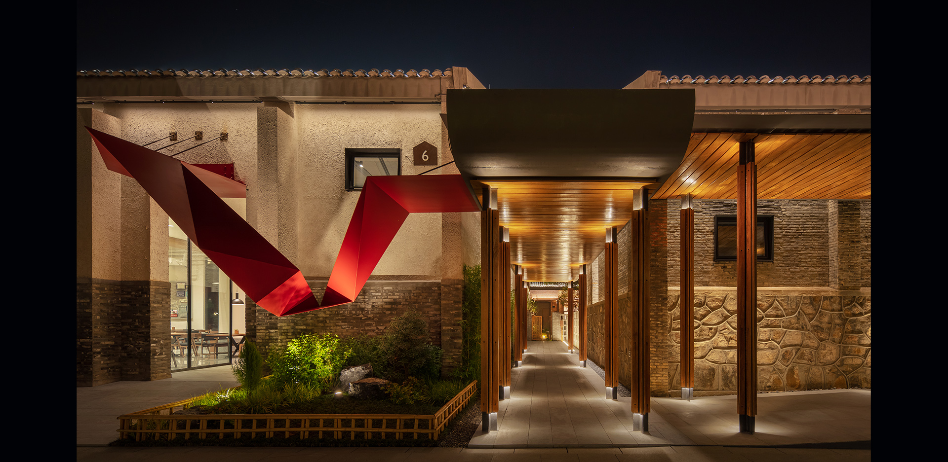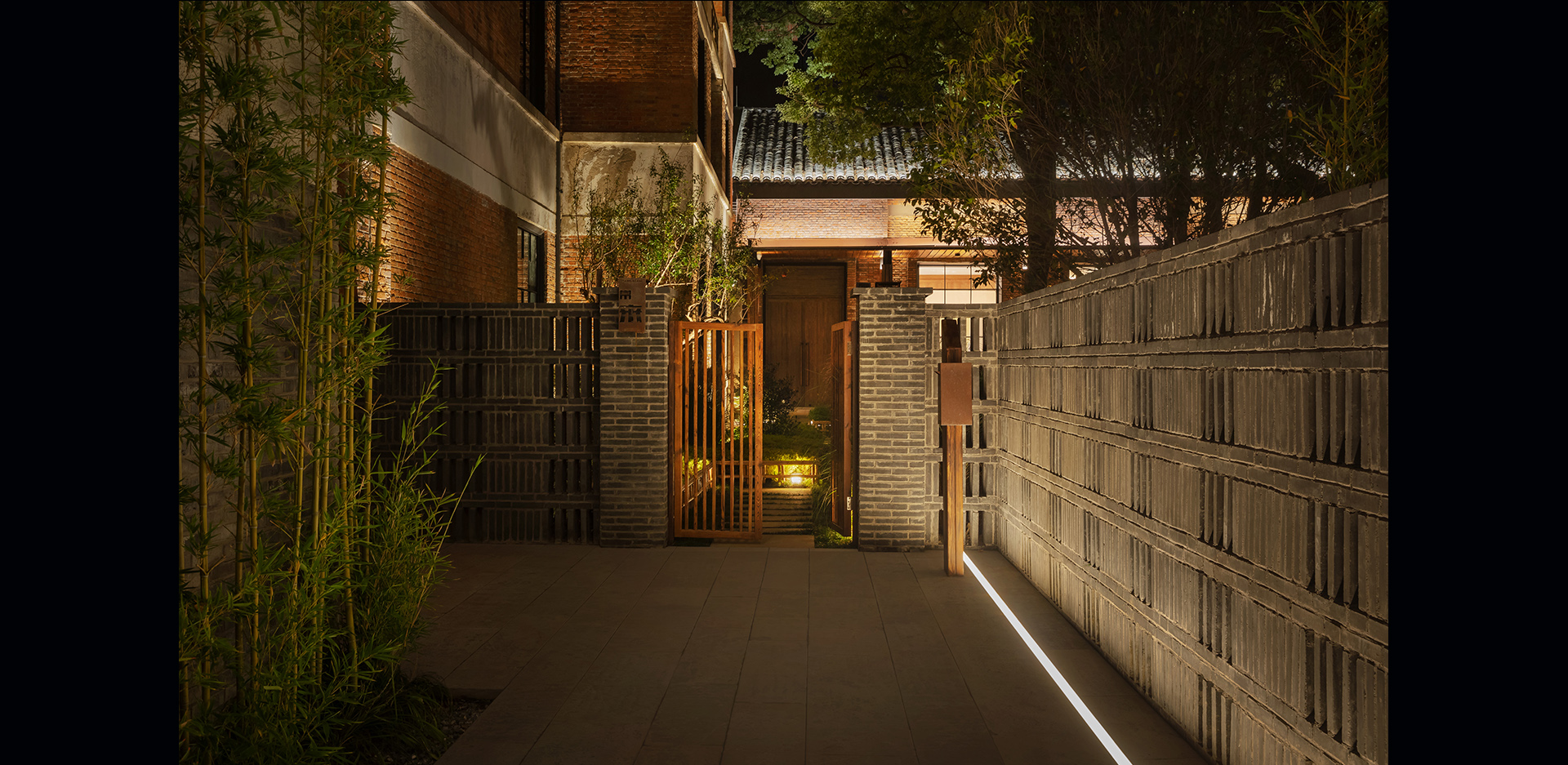 内庭院会议区入口,此空间作为外部连接私人空间的过渡区,以连廊进行穿插,使厚重单一的建筑多了些空间层次,为确保光的递减柔和,借用景观的功能灯的光,进行补充照明,不刻意突出该入口的亮度,使视觉可以直接被内部的光所吸引,更能显示出内部院落别有洞天的意境