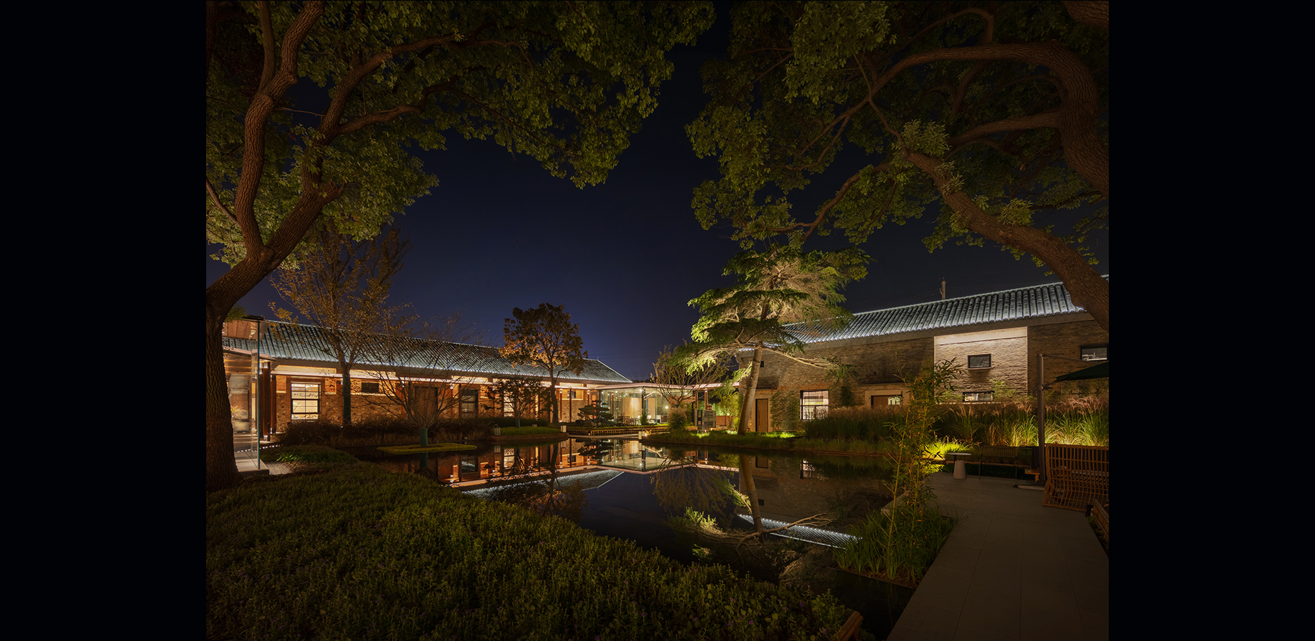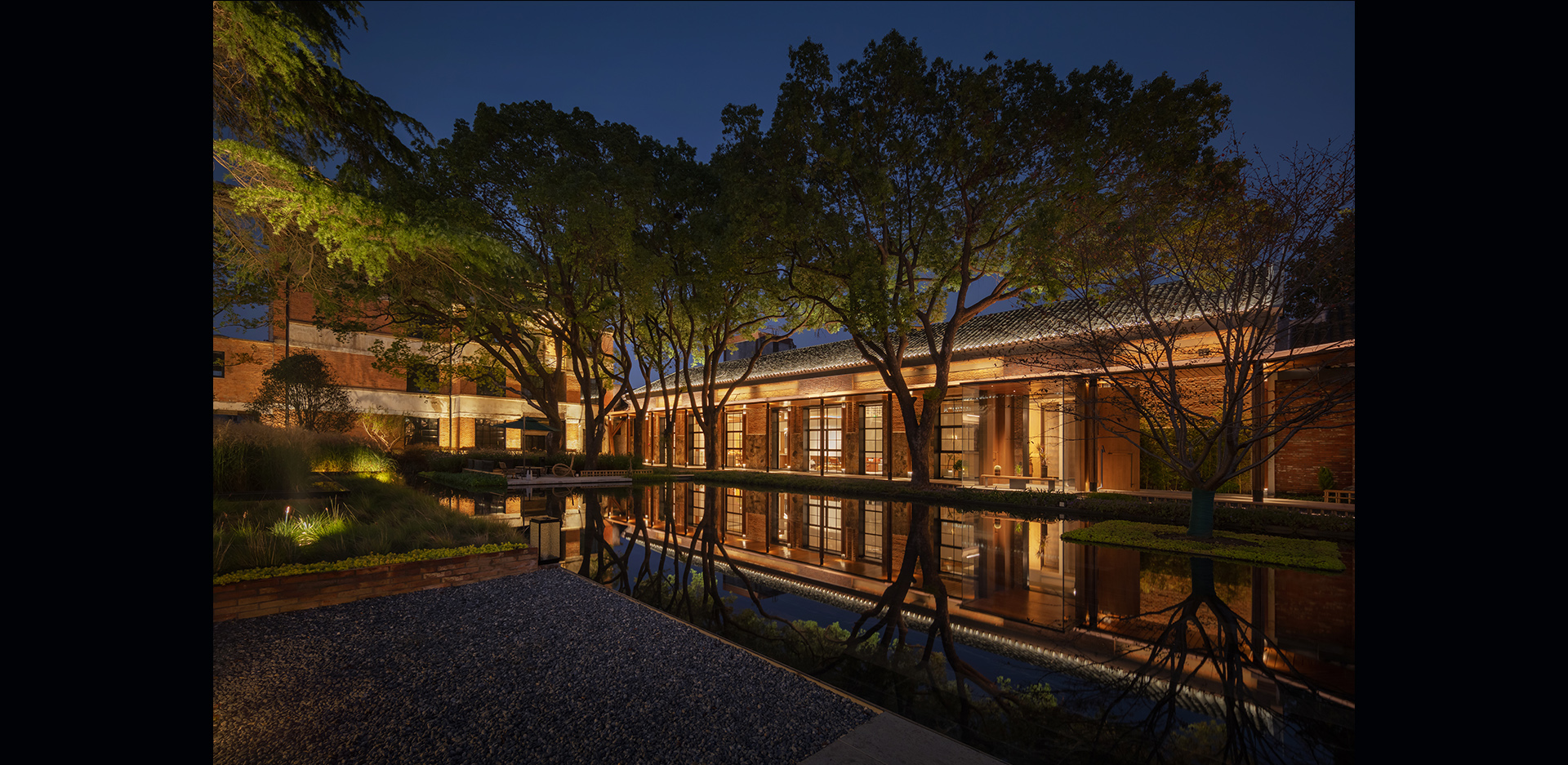 庭院为私人办公会议空间,让使用者能大尺度的感受空间的景深感,以树干作为前景剪影,建筑作为背景,画面层次更为丰富,同事也运用水面镜像,使其产生视觉空间体量扩张的效果。