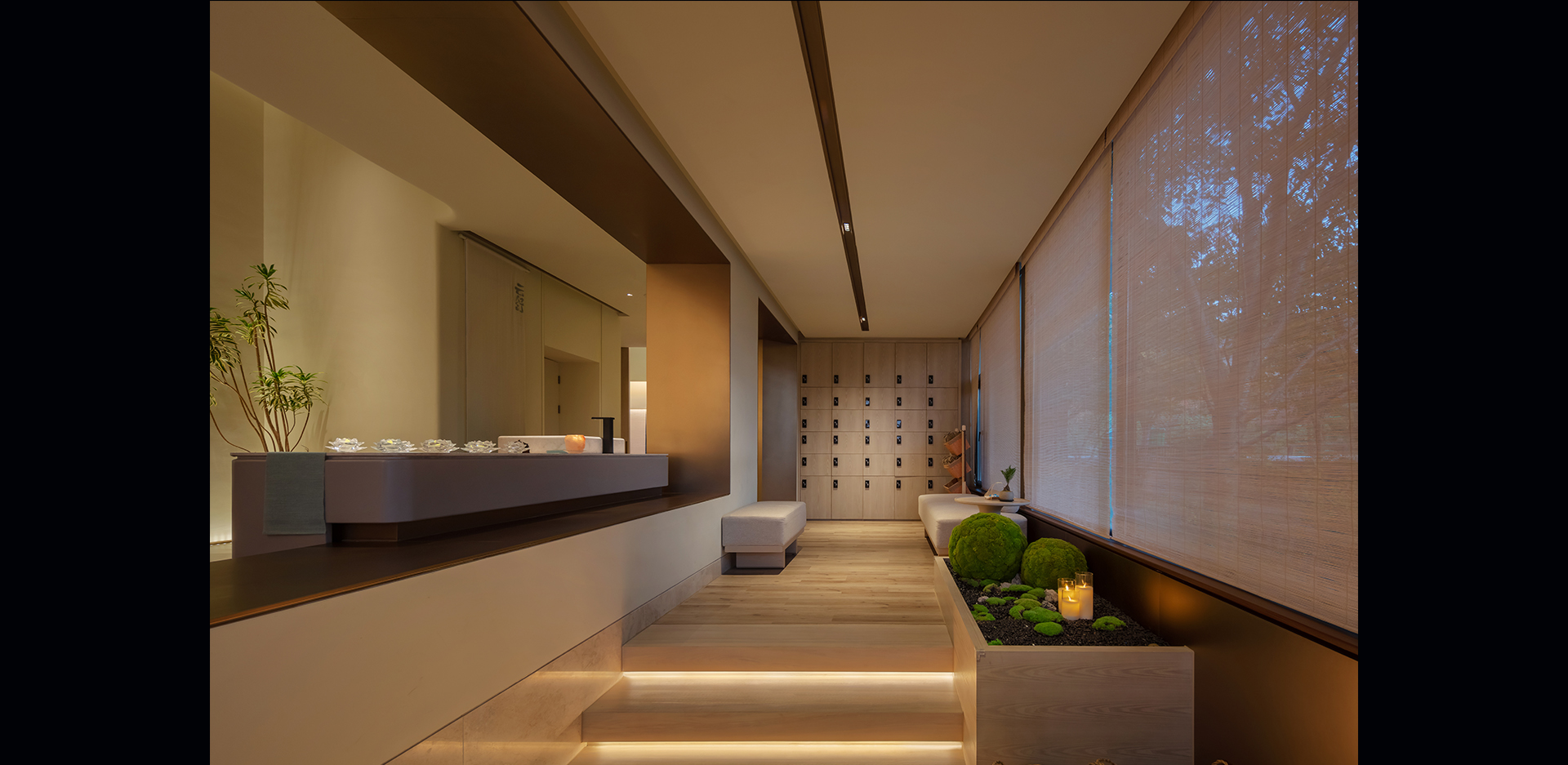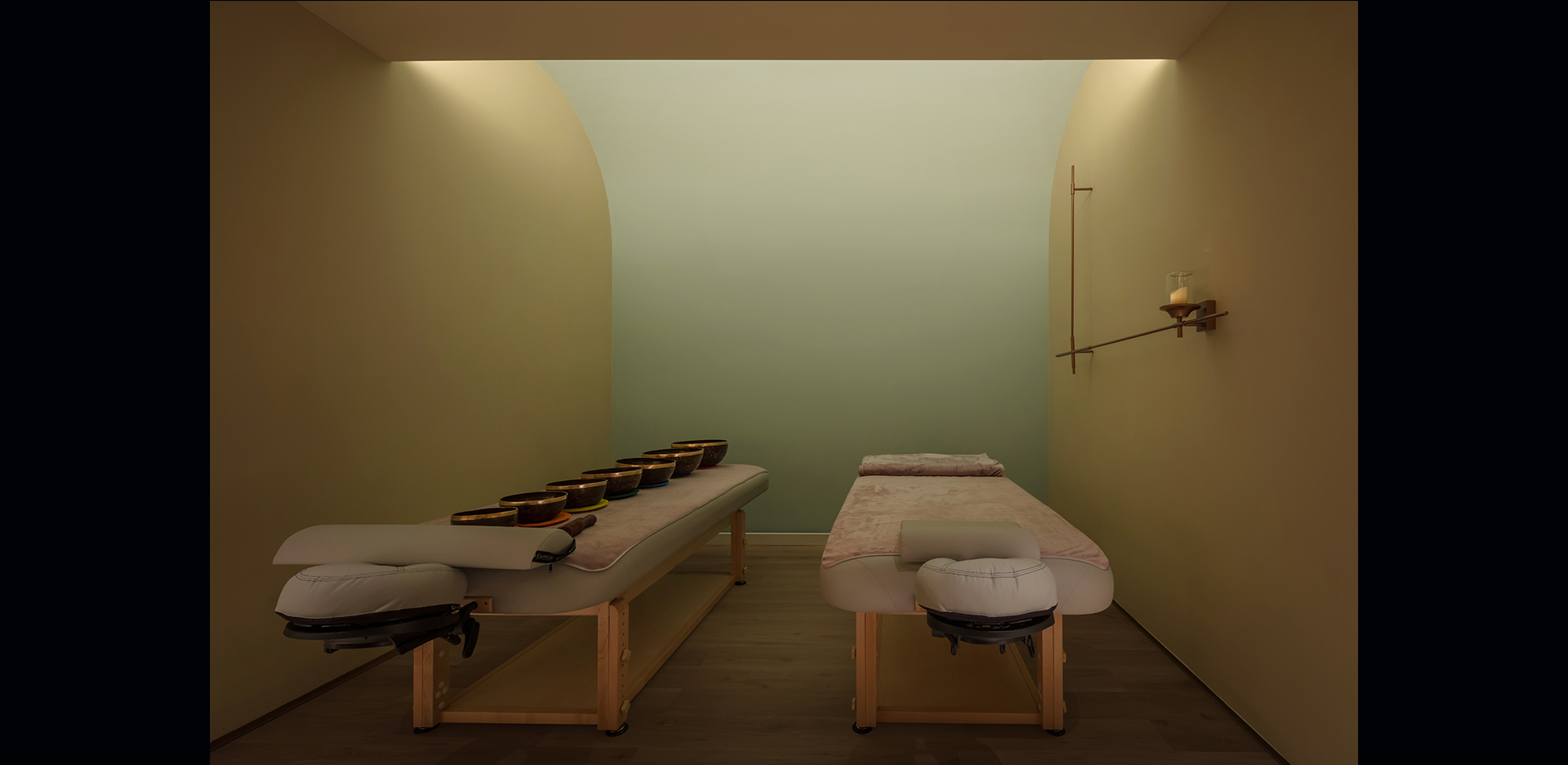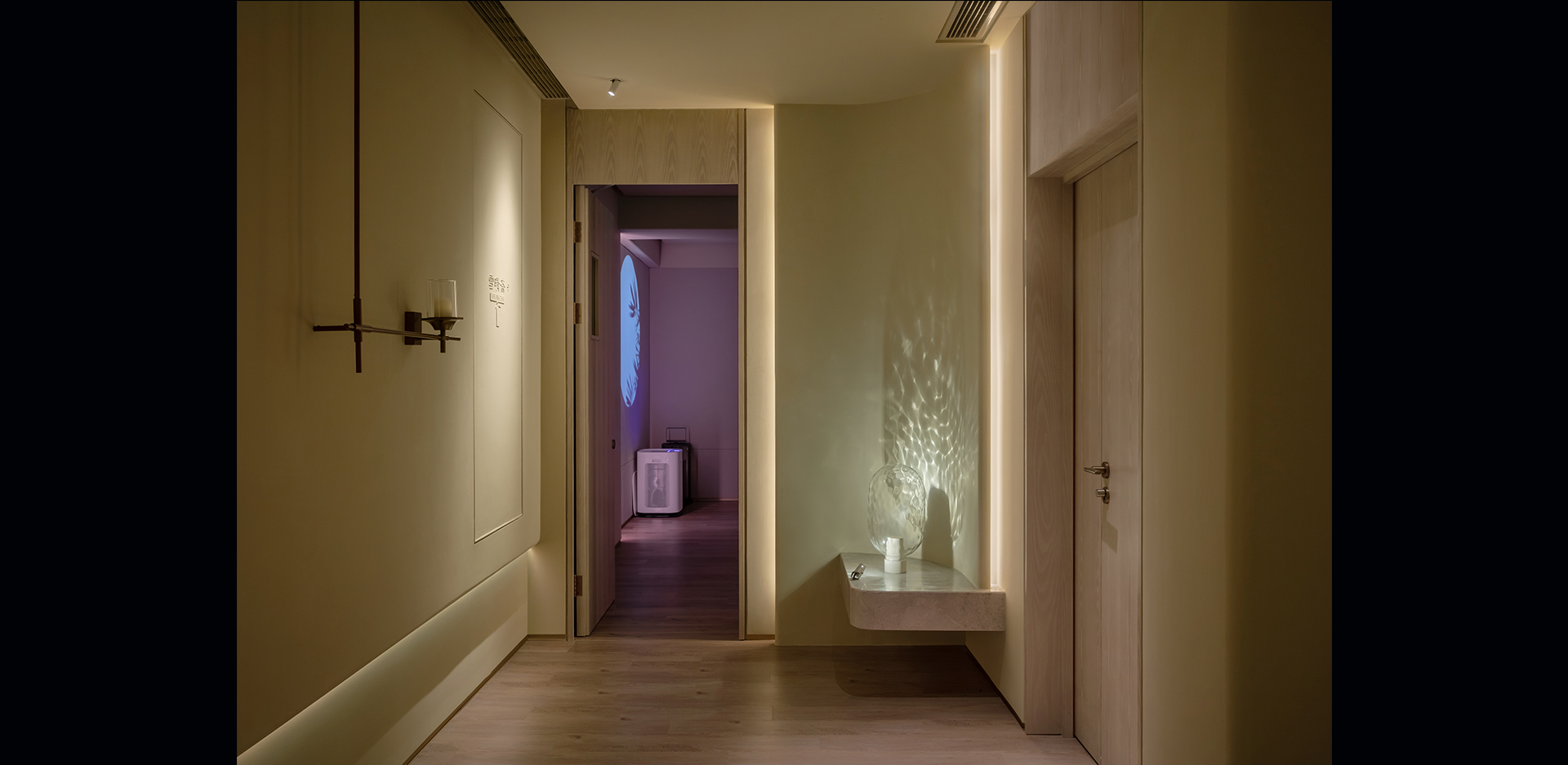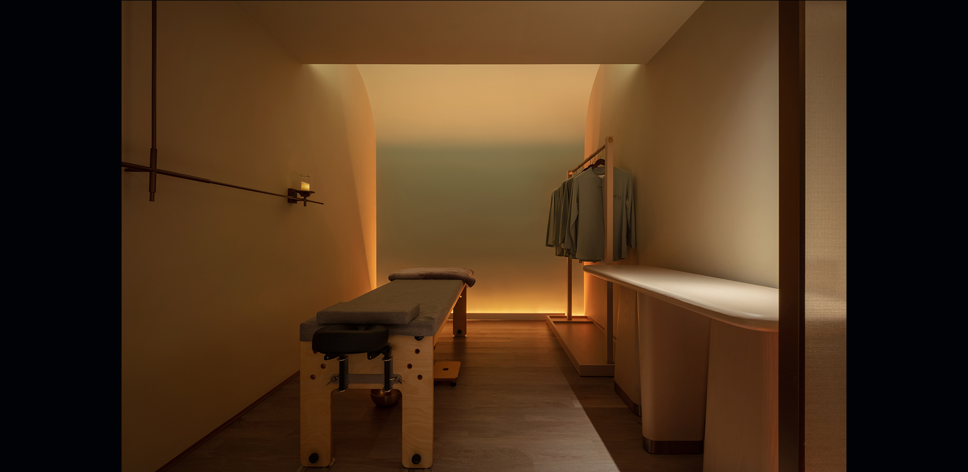 独立疗愈空间,同样是通过间接照明的手法来实现舒适温和的光环境,可变颜色RGBW并通过DMX控制来实现场景的调用,通过疗愈师的引导让体验者可以在此空间释放压力,缓解身体的疲劳,甚至可以在此空间睡上一觉。