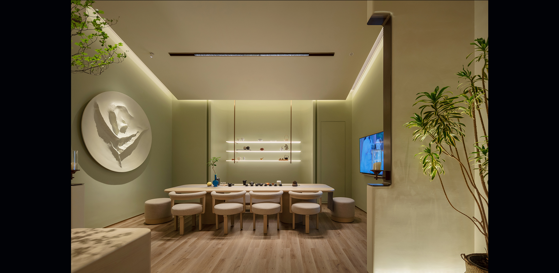 云舒馆有一层和负一层上下两层空间,一层主要是接待、品茶及沙龙活动,白天自然光也相对充足,属于比较“热闹”的空间,灯光环境相对明亮一些;负一层属于地下空间,有四个以疗愈为主的围合式的独立空间,属于比较“安静”的空间,灯光环境相对比较暗,带有一定的神秘氛围。