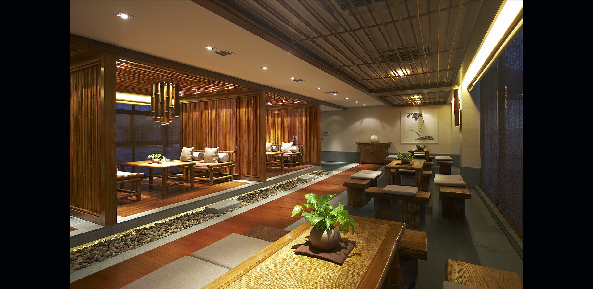 采用节能的光源和高效的照明器,科学合理地运用照明控制,使照明设施与室内装饰的融合,充分展现安静舒适的环境,不管在哪一个角落都能感受到浓浓的禅意,每一处都让设计师颇花心思,朴素中透着精致。