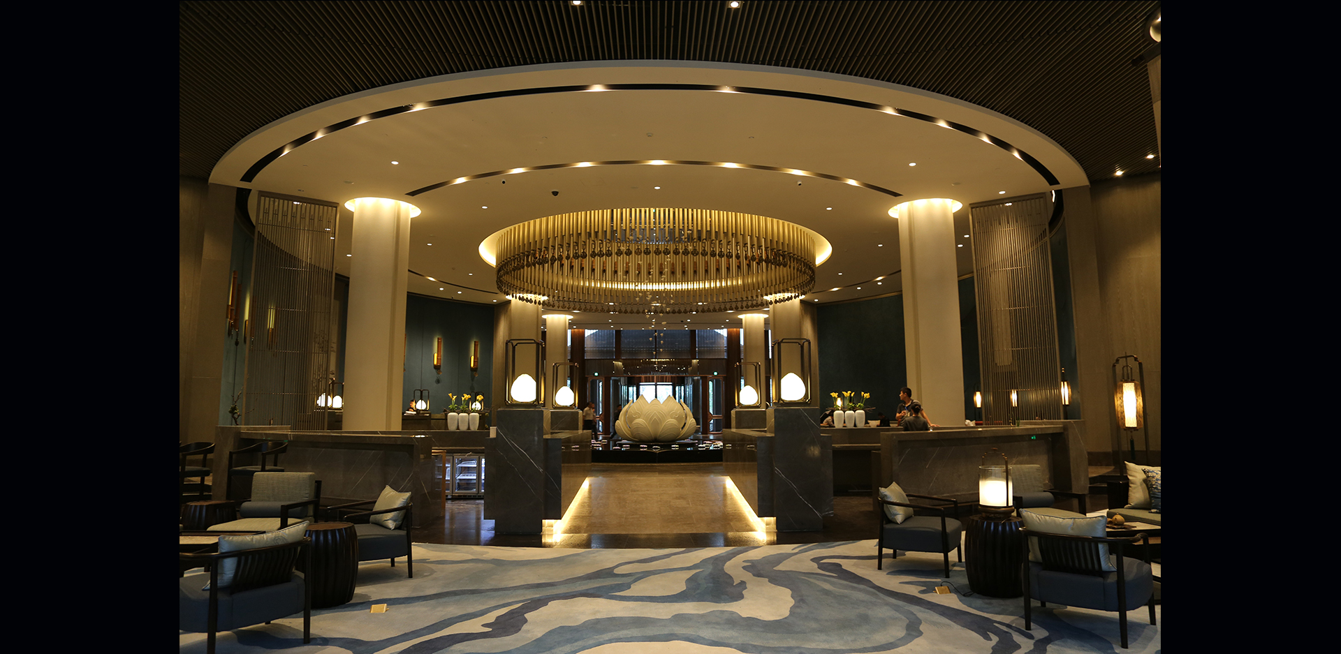 拈花湾小镇中******的建筑是波罗蜜多酒店和国际会议中心,并承担第四届世界佛教论坛大会的会议和住宿安排。酒店建筑依山而建,建筑设计以“圆融”为概念设计的犹如福建土楼一样的半环形建筑;灯光采用“少即是多”的原则,避免对住客的干扰又对建筑做了完美诠释。