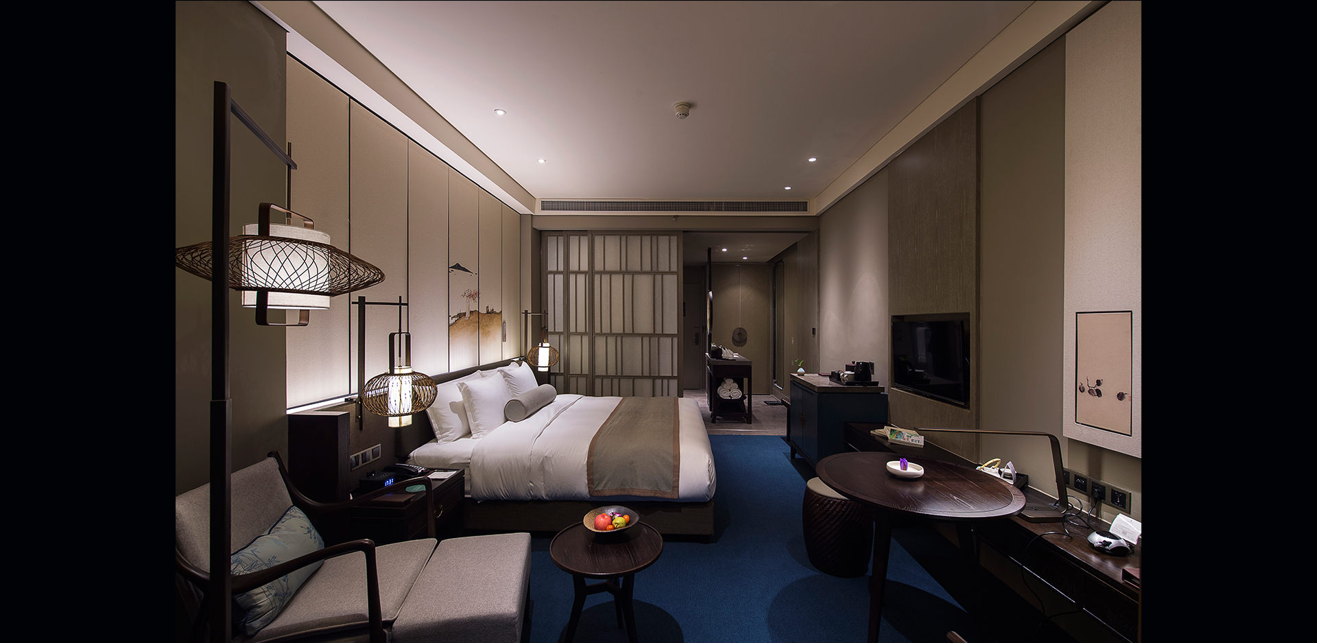 酒店拥有客房共计415间, 宴会中心面积共计5000平方米,游泳池、健身房、棋牌室等配套设施一应俱全。酒店室内装饰以清净安详、自然禅境为设计主题,灯光设计延续室内设计的禅意风格,照明效果取决于空间合理的光分布及光色的选择及对比,以营造倾诉人心与感性的光环境。