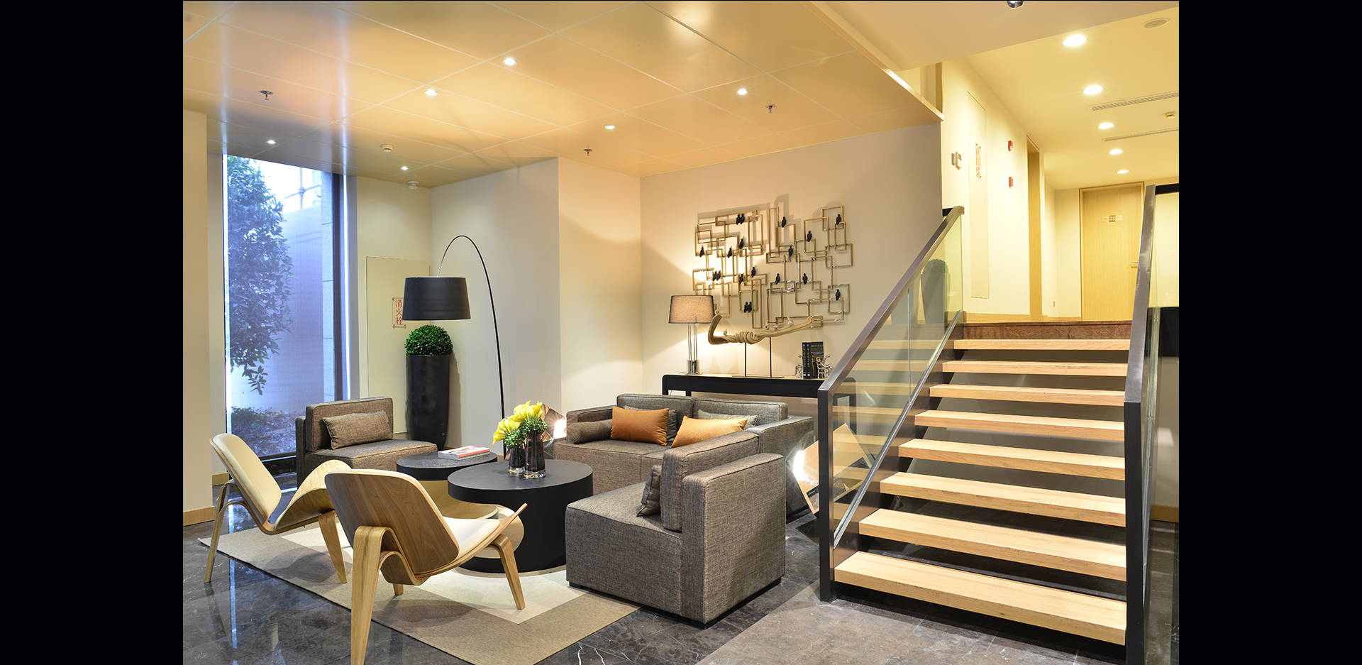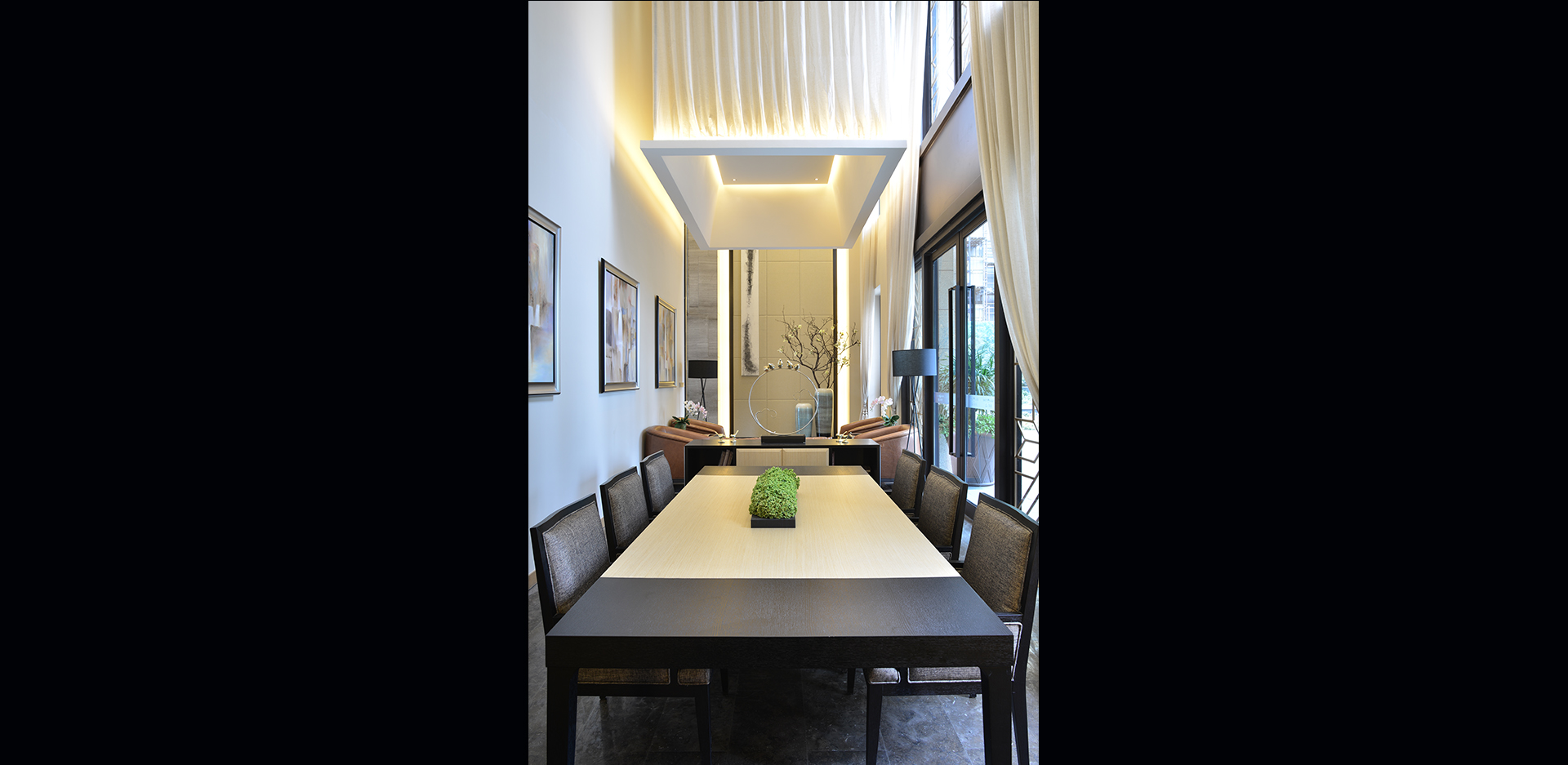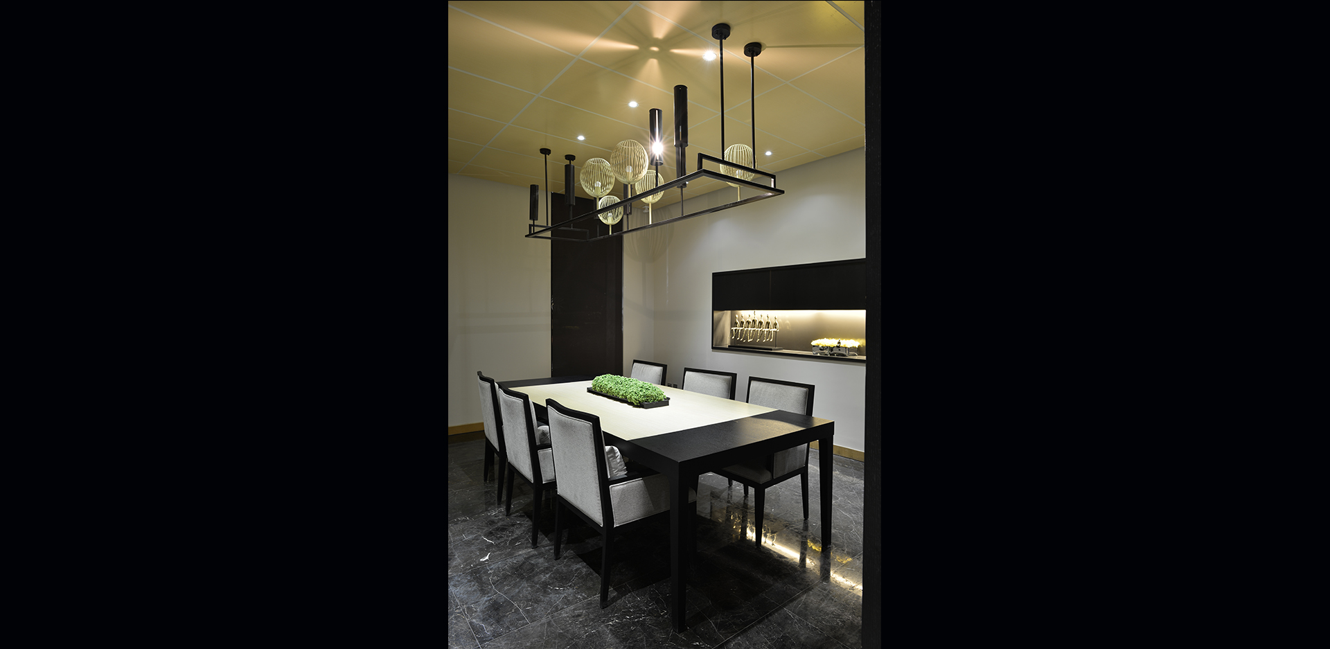 签约室的照明相对正式,但却不会感到严肃和压抑。顶部的艺术花灯以及壁龛重点照明,无一不彰显出谷水湾优雅的生活品味。