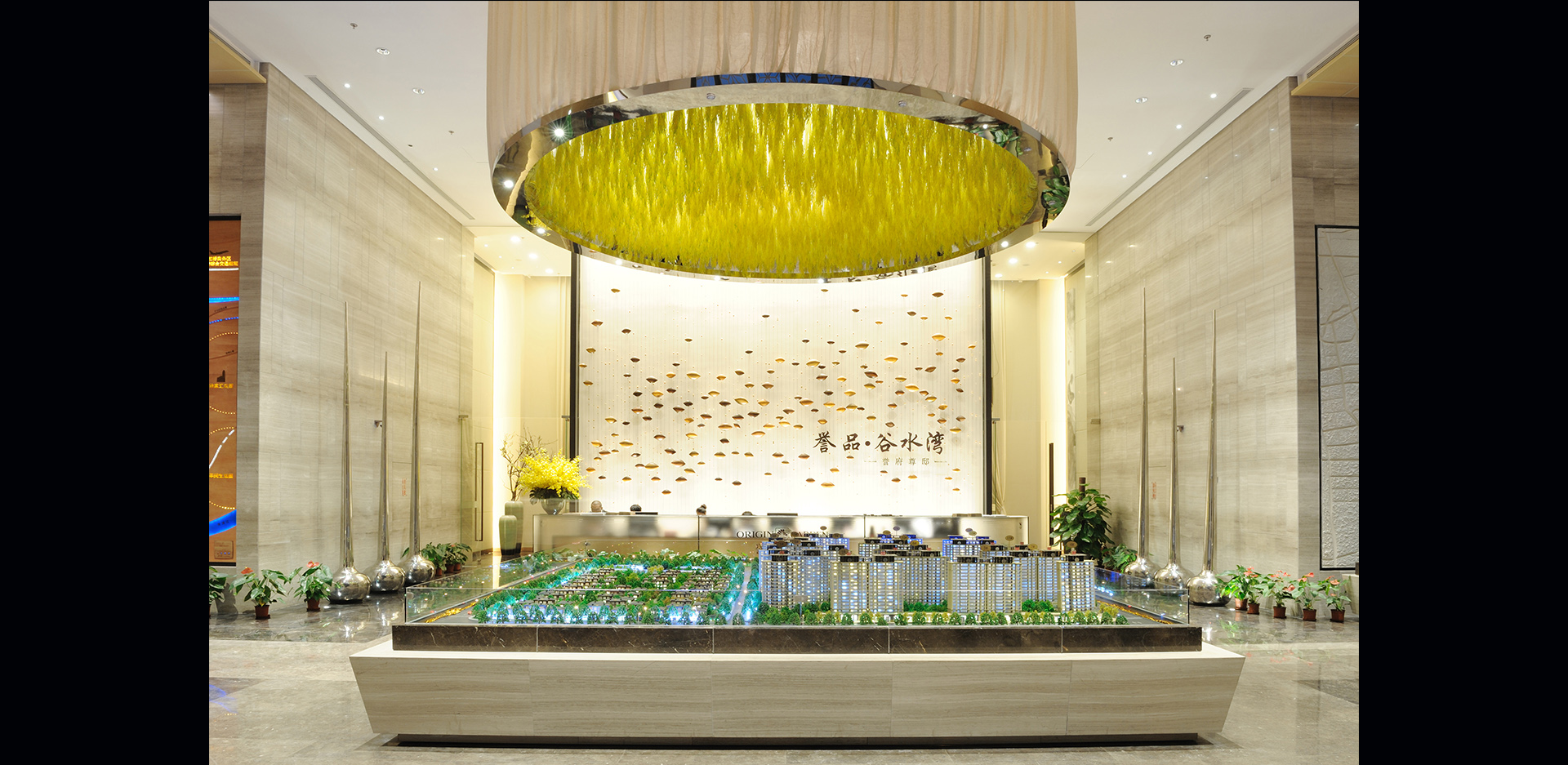 谷水湾坐落于上海松江,是一个富有地域文化底蕴的售楼建筑兼后期会所。大堂沙盘上方巨大的稻谷灯为室内设计重点,均匀的T5光源加上局部重点照明,营造出属于麦田的金色世界,背景墙上如同在琴弦上舞动的谷粒装置与之相呼应,更好的突出谷水湾的设计主题。