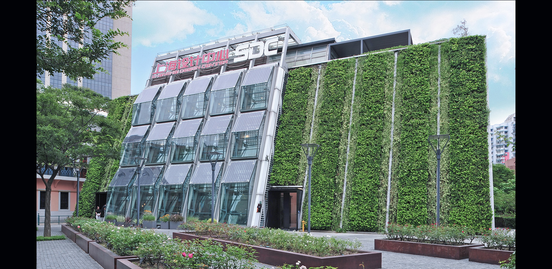 联合设计办公室地处中国上海世博城市最佳实践区,该实践区为北美之外首个获得专业机构认证的LEED-ND铂金级预认证绿色街区。办公室前身为“会呼吸的建筑—阿尔萨斯案例馆”,整个建筑以节能、绿色、舒适、智能为设计理念,建筑南立面倾斜的墙面一部分由大面积绿化覆盖,另一部分为整片的水幕太阳能玻璃幕墙,幕墙由三层组成—外层为太阳能电板及玻璃、中间为可开可闭的空气层、里层为玻璃层,幕墙通过电脑自动控制,随着室外温度和日照强度的变化自动开闭,从而减少对空调的依赖。(冬天经阳光照射及光电板产生的热量加热中间密闭的空气层并通过循环持续地给室内供暖;夏天打开外层玻璃进行热空气和新鲜空气的热交换,同时通过太阳能板发电泵送水流过内层形成一层水帘,在隔热的同时也能带动空气流动,加上太阳能板产生的阴影,从而给整座建筑降温)。